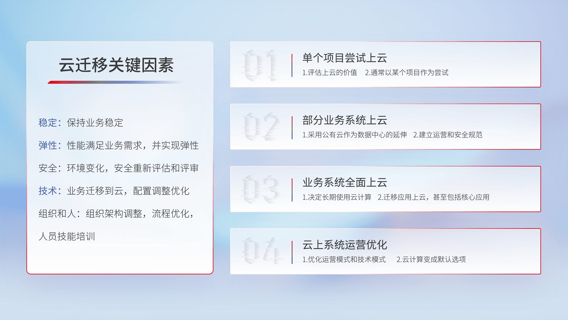 结合实际业务,,从规划设计、、、云平台选型、、、、云原生改造、、、、数据迁移、、、集成交付,,,,迁移全过程为客户识别最佳上云路径,,,,做好风险识别管理,,设计网络架构、、、身份权限、、、安全审计合规、、、操作审计、、日志审计、、监控告警策略、、多站点容灾设计等,,对云上基础设施进行整体规划,,,,提升IT治理水平,,,,以满足弹性、、、高可用、、高性能的需求。。
