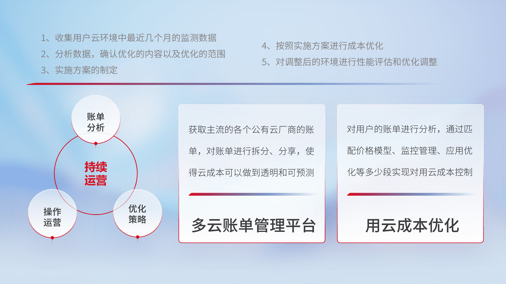 通过多云纳管,,,,以统一的资源数据模型把客户的云资源进行抽象和封装,,,进而实现对多云资源的统一操作,,保障云资源管理的可靠性、、、、稳定性与可用性。。。量身定制化运维内容,,,,配置、、开发运维、、、、补丁管理、、、备份、、、、监控、、、认证和访问管理、、、、审计和日常巡检等,,保障在用云过程中的可靠度,,,稳定度以及高可用率。。。